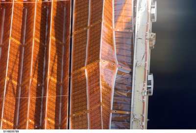 The old panel developed kinks in some of the panel sections (see above) during the retraction procedure. Slack guide wires halted repeated attempts to extend and retract the panel -- an effort by the crew to work out the kinks. Eventually the crew left the panel partially extended, but far enough out of the way to clear the new array.
